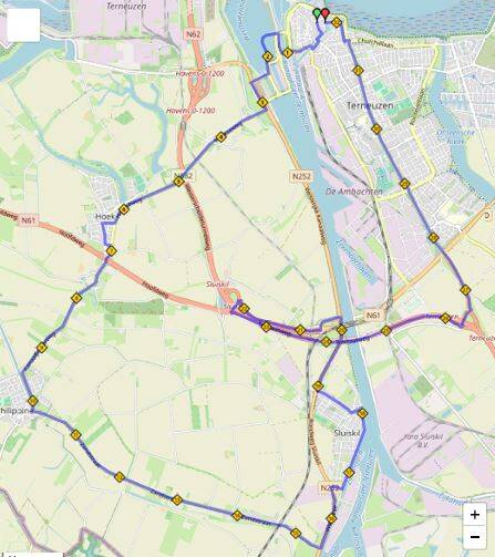 We reden over de sluizen via Hoek naar Philippine, om via de Zandstraat, door Sluiskil en dwars door Terneuzen terug op het Stadhuisplein uit te komen.